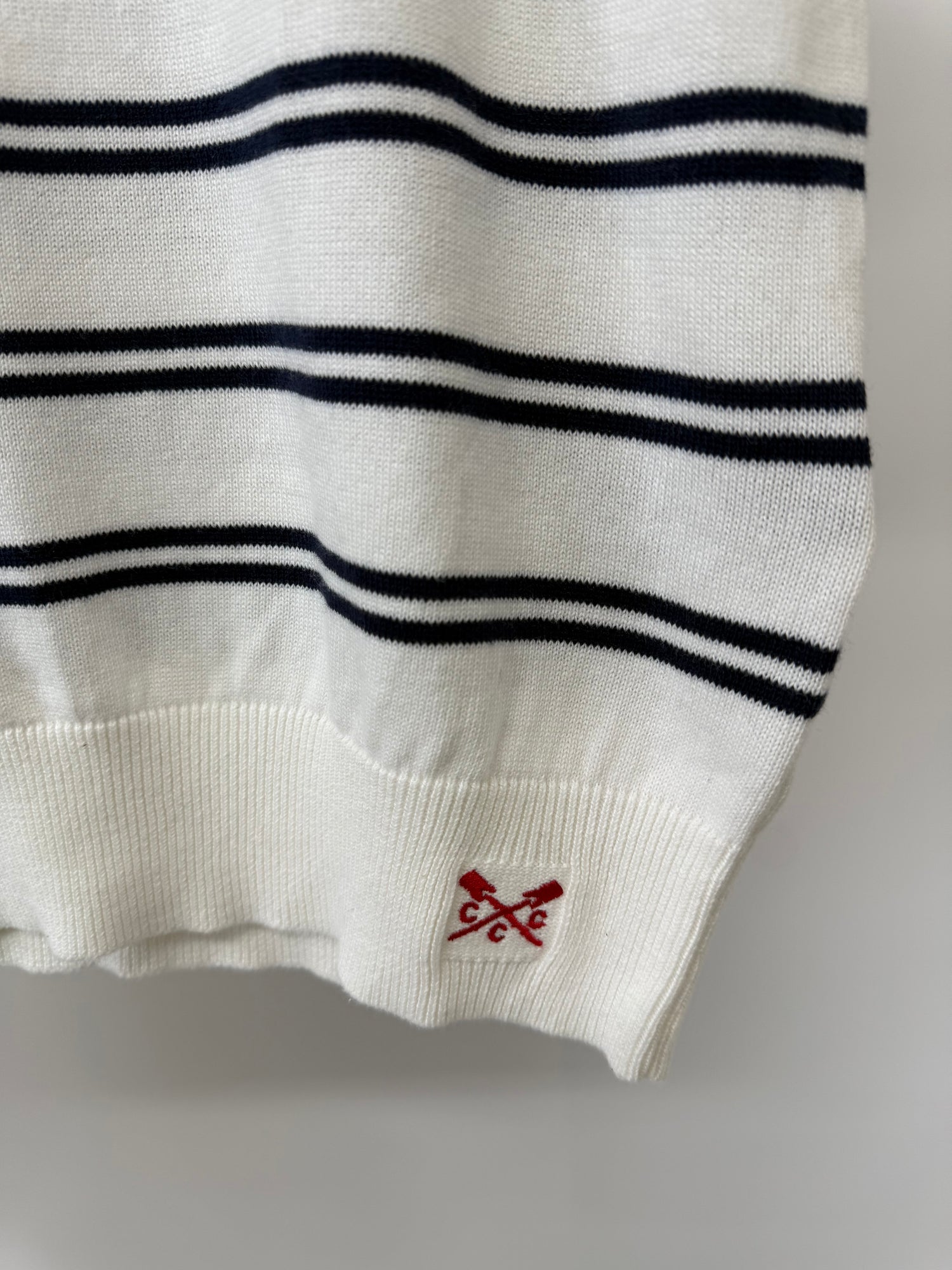 The ribbed scalloped neckline, ribbed cuffs and hem and small logo design in the pop of red. Horizontal stripes and slight puff style sleeves made in fine knit design 100% cotton.
